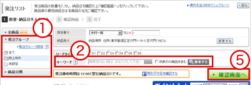1発注グループや商品分類、2キーワード検索で、発注する商品を検索します。