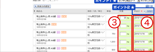 ポイント1発注する商品を探しやすいように並び順・表示数の変更が行えます。