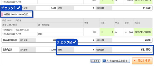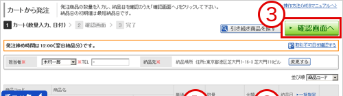 カートに入れてあった商品が上に表示され、その下に発注リストから選択した商品が表示されます。