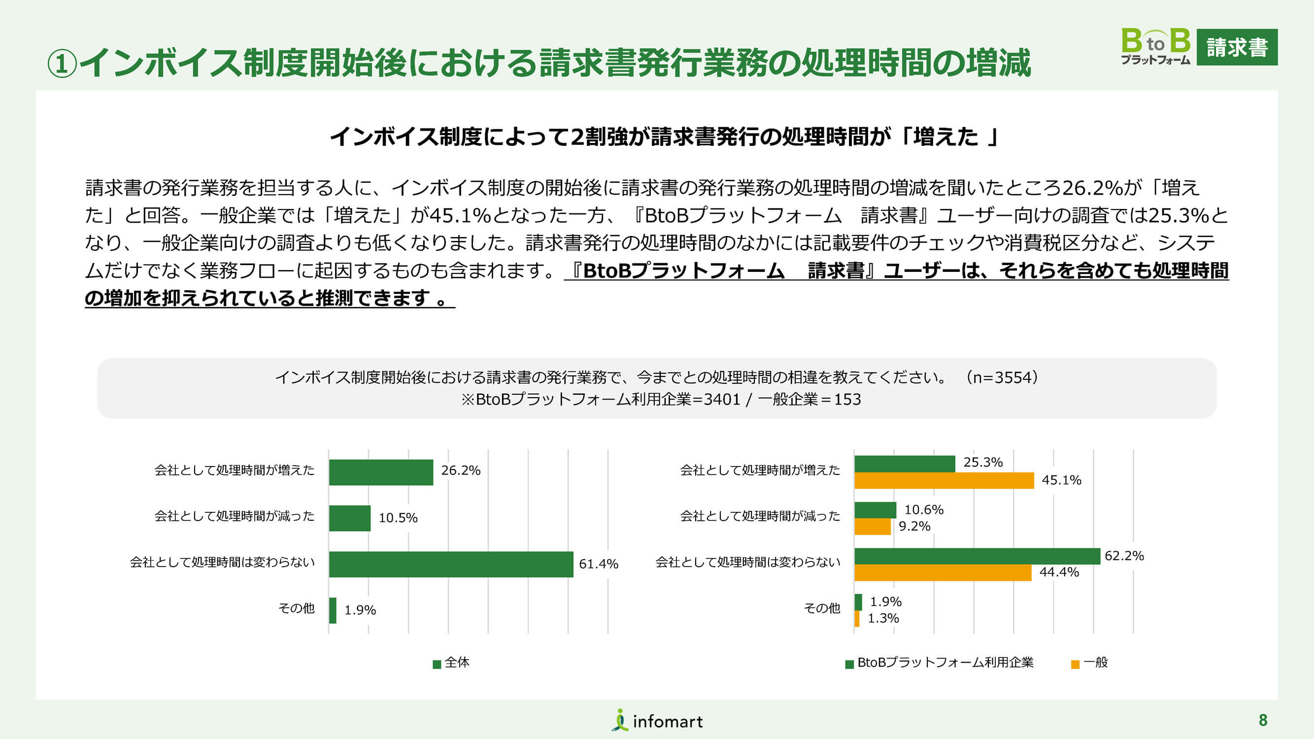 インボイス制度施行から1年が経過したことを機に、経理業務の現状把握を目的としたアンケート調査を実施いたしました。 調査には6,000名以上の方にご参加いただき、インボイス制度導入後の請求書処理時間の変化や、業務上の課題について具体的なご意見を伺いました。 また、依然として残る紙の出力など、明らかになった課題を解消するための電子化に関する最新のトレンドも併せてご紹介しております。