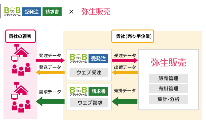 BtoBプラットフォーム 受発注で受注したデータを弥生販売に取り込み、出荷データを発送データとして取引先に送ることができます。売掛データは、BtoBプラットフォーム 請求書を通じて取引先に電子請求することができます。